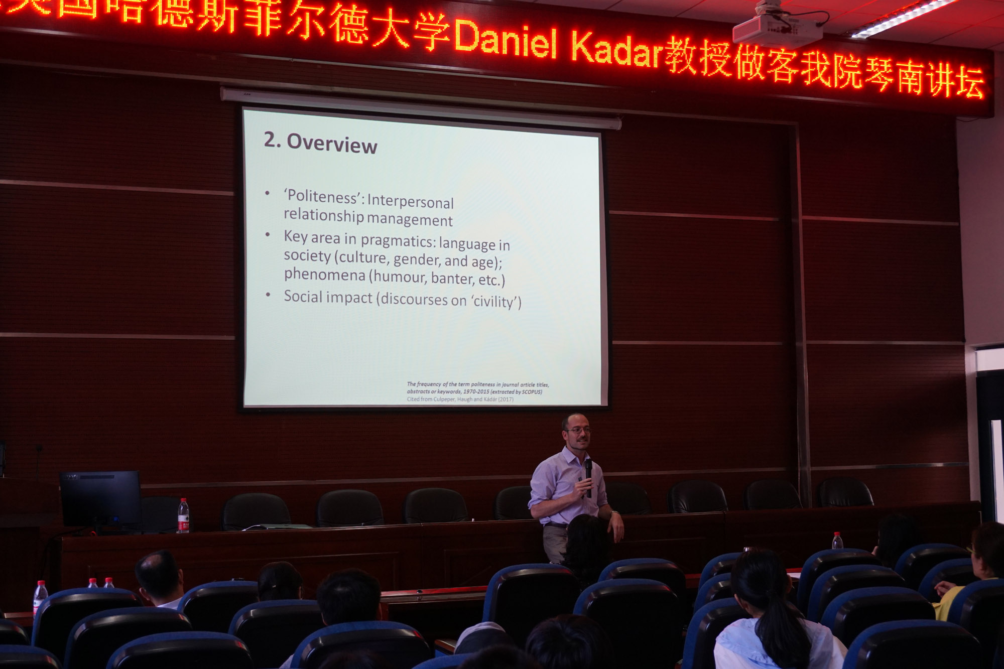 在近两个小时的讲座中,Daniel Kadar教授以东亚语用学为核心,向在座师生介绍了东亚语用研究发展,并特别强调了中国学者在高水平语用研究中的独特地位。Daniel Kadar教授指出,自语用学建立之初,东亚语用学就占有重要地位。但是,直到《东亚语用学》杂志与其他相关杂志的创立,东亚语用才引起学界更多的关注。