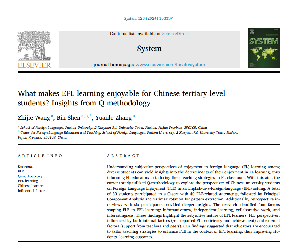 2021级外国语言学及应用语言学专业学术型硕士生王志杰关于外语学习愉悦度(Foreign Language Enjoyment;FLE)的最新研究成果。论文题为“What makes EFL learning enjoyable for Chinese tertiary-level students? Insights from Q methodology” (//doi.org/10.1016/j.system.2024.103337)。该论文的第二作者兼通讯作者为沈彬副教授,第三作者为电影天堂