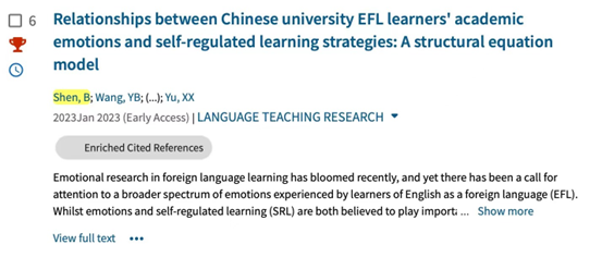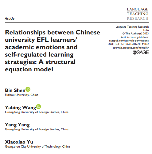 沈彬副教授作为第一作者的论文“Relationships between Chinese university EFL learners’ academic emotions and self-regulated learning strategies: A structural equation model”入选社会科学(综合)(Social Sciences, general)领域ESI全球前1%“高被引论文”(Highly Cited Papers),论文于2023年1月发表在SSCI一区期刊LANGUAGE TEACHING RESEARCH上(IF: 3.3/ 5-year IF:4.3,中科院1区Top期刊)。