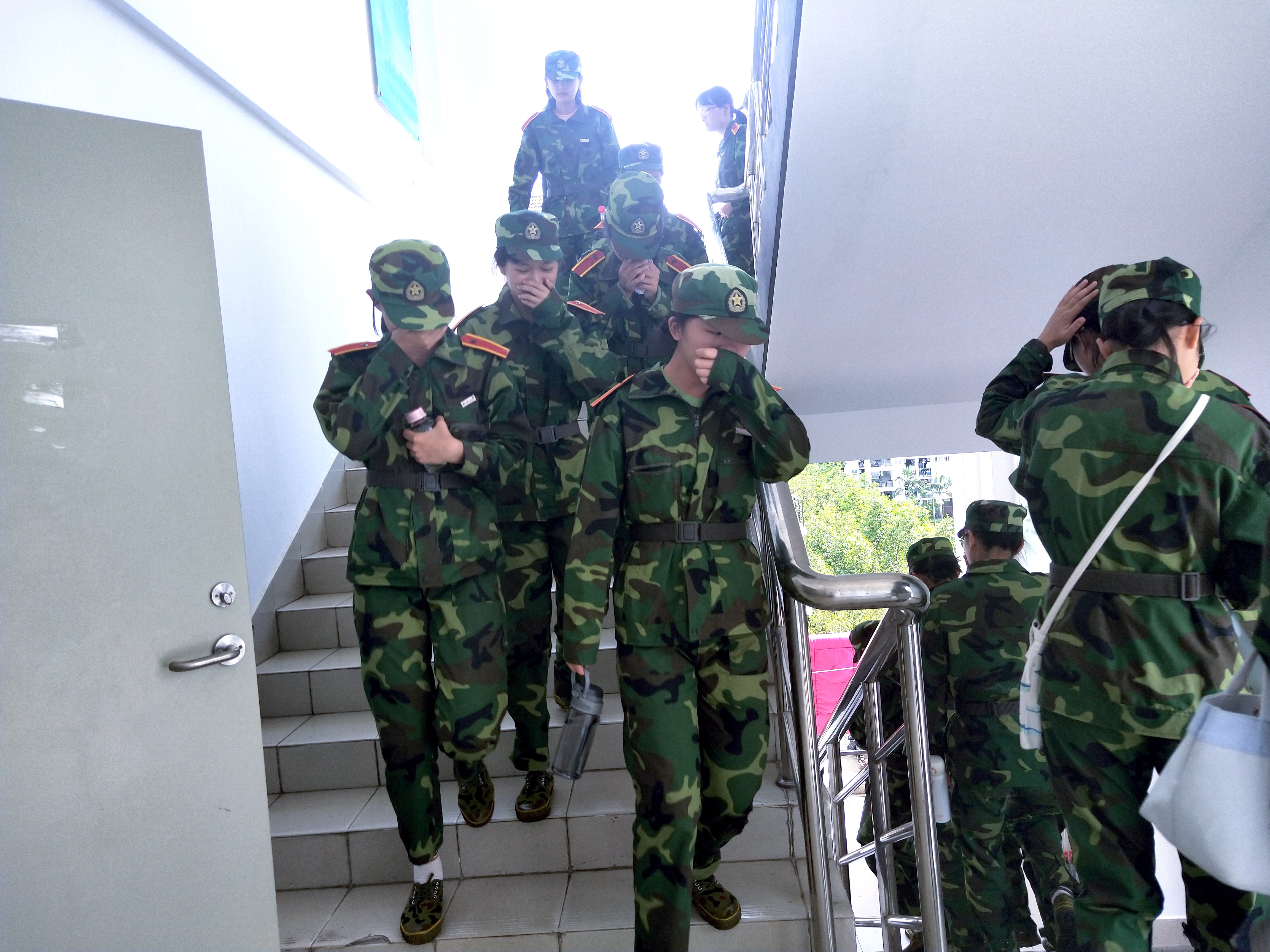 开始新生逃生疏散演练。各楼层同学按照逃生指导进行断电、准备毛巾等相关工作后,迅速有序地从宿舍楼撤离。撤离下楼梯时,同学们不慌不忙,井然有序跟随着各班安全员的指引以弯腰、手捂口鼻的标准姿态成功抵达已经划定好的安全区域内集中。