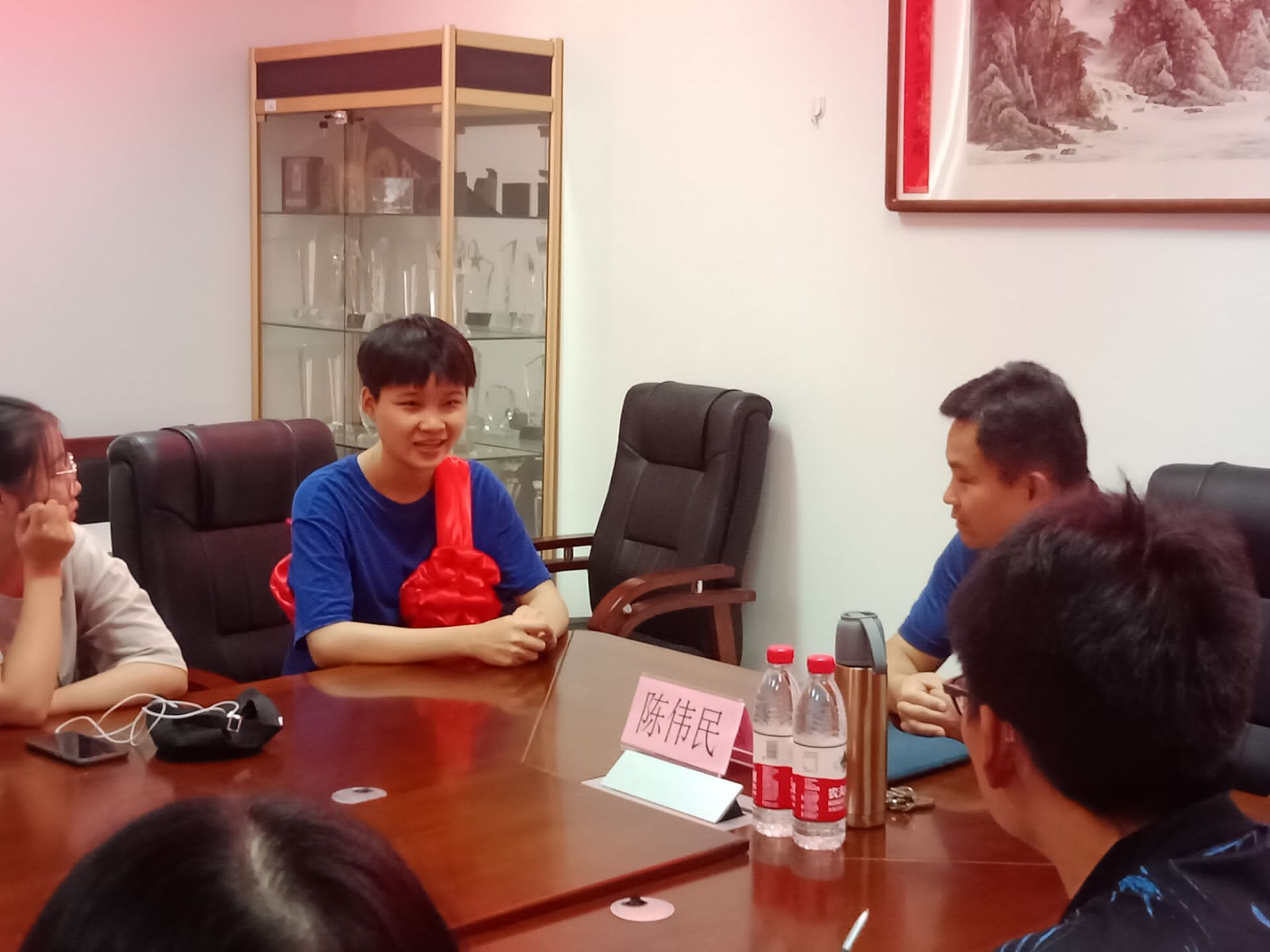 欢送陈慧敏同学光荣入伍座谈会在院办208会议室召开。院党委陈伟民书记、78年入伍的退伍军人赖斌老师、辅导员唐斌湖老师、陈慧敏同学及17级班委参加。座谈会由唐斌湖老师主持。
