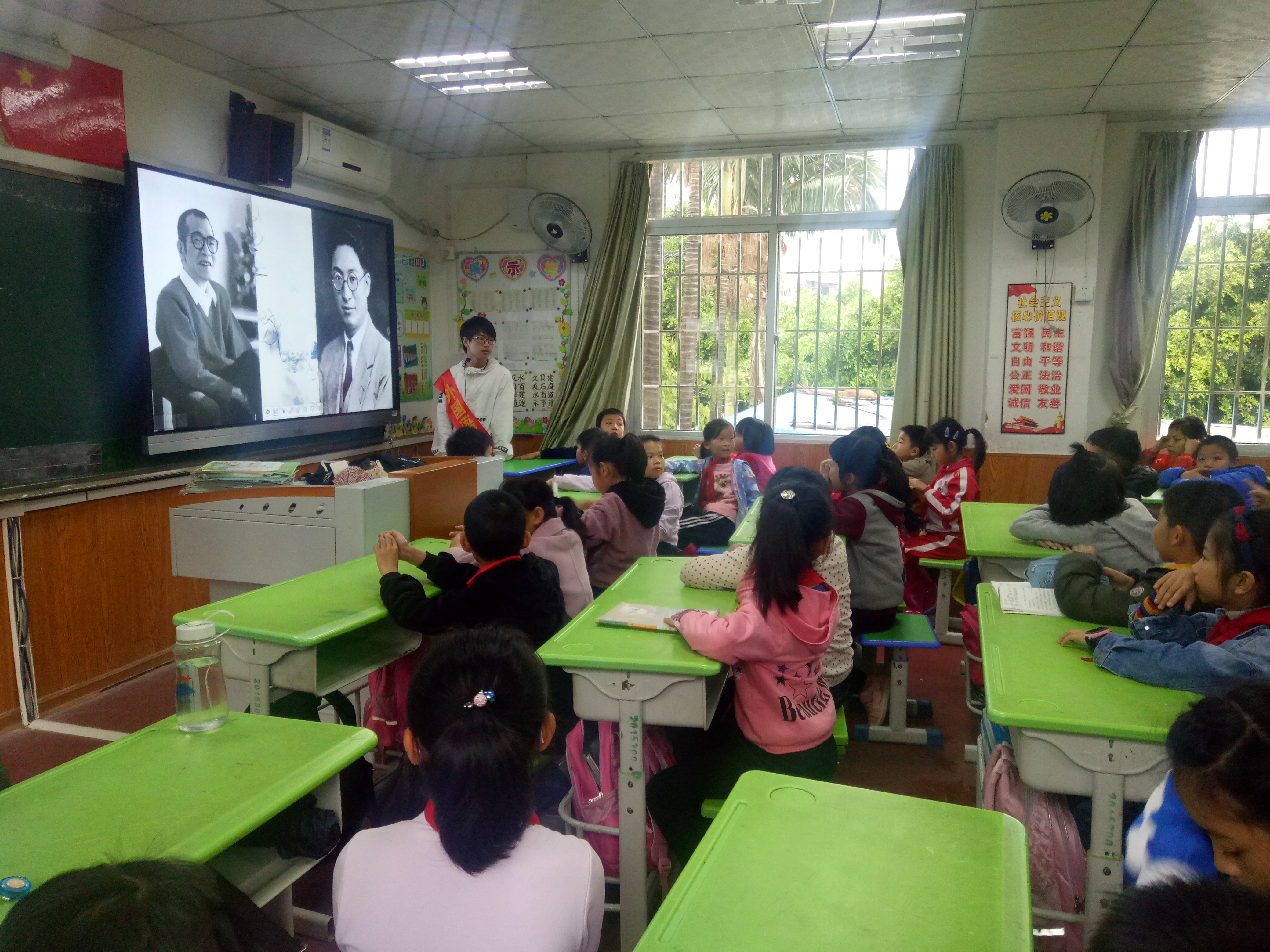 课堂上,主讲志愿者林海彬首先向学生们介绍林则徐、林觉民、冰心等福州的历史名人与英雄,并与同学们一同朗诵冰心的著名诗歌,将家国情怀传递到每位同学的心中。随后,主讲志愿者简要介绍了我国的民族起源、朝代更迭与疆域变化。随着一段剪辑视频《航拍中国》的播出,志愿者教同学们齐声念出每一个出现在视频上的城市名,让同学们体会到祖国山河的宏伟壮丽。