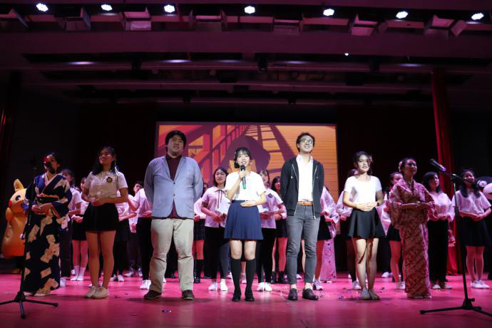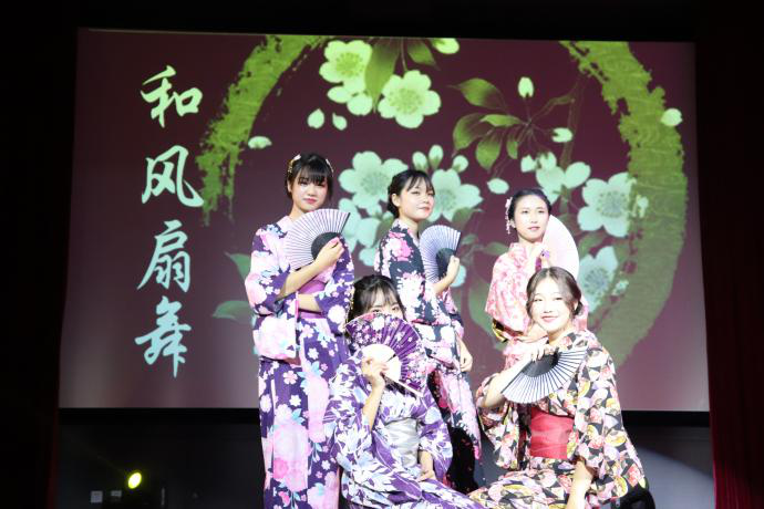 晚上7点,汇报演出在娓娓道来的《野玫瑰》、《只凝望着你》歌声中准时开场。随后,未来式(wills)乐队采用中西乐器结合的演奏方式,带来优美的中国风歌曲《奈何》与和风歌曲《落樱》,让观众们感受到了中日音乐的共同魅力。接下来,幽默而不失浪漫的戏剧《你的名字》、活泼热情的独唱《恋爱循环》、完美还原的配音《魔女宅急便》、充满青春活力的舞蹈《nekkoya》与浪漫的两人对唱《Lemon》点燃了会场气氛,赢得了观众热情与掌声。