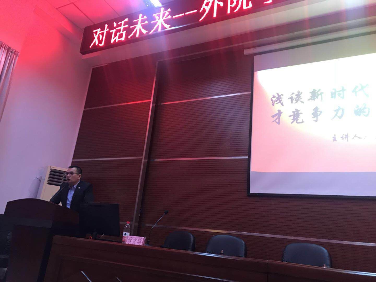 94级英语专业院友蔡文质先生担任主讲人。蔡处长结合自身学习成长经历,以新时代国际型人才竞争力的自我提升方面为主题,向大家分析了新时代背景下国际型人才的前景,并就听说读写译如何提高、如何学习外语、大学期间学习能力、实践能力、交流能力、适应能力的培养等问题与大家分享经验,提出建议。