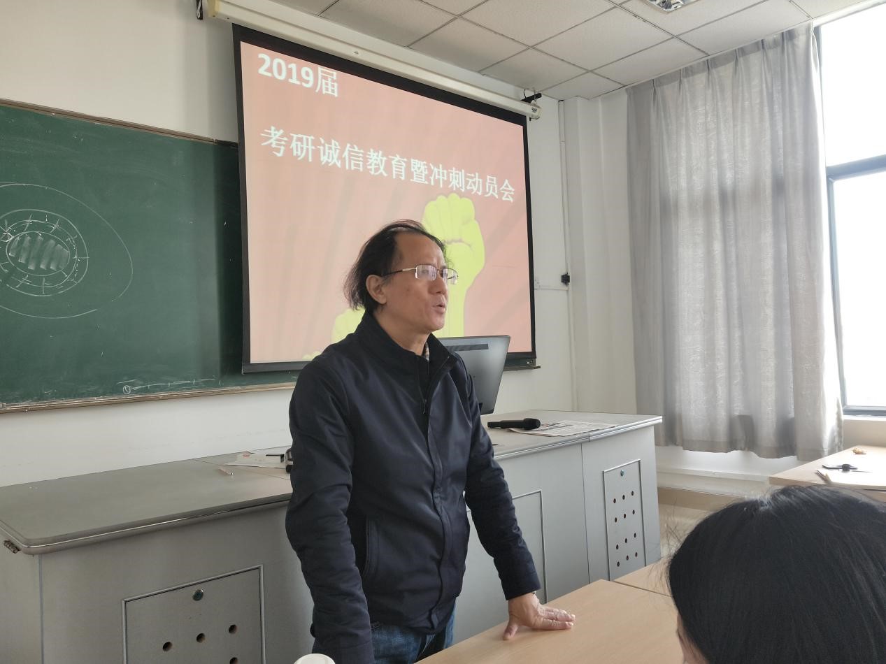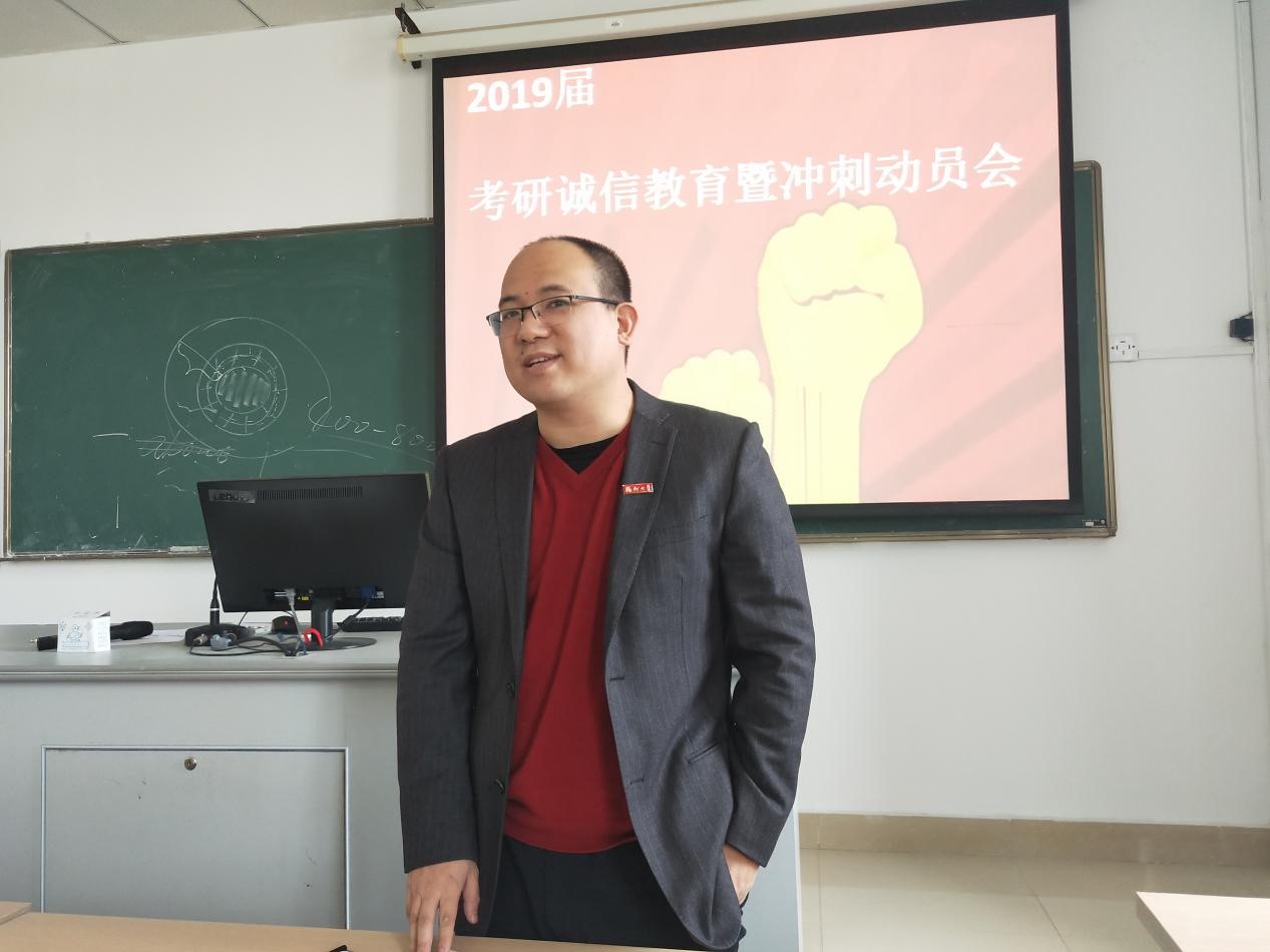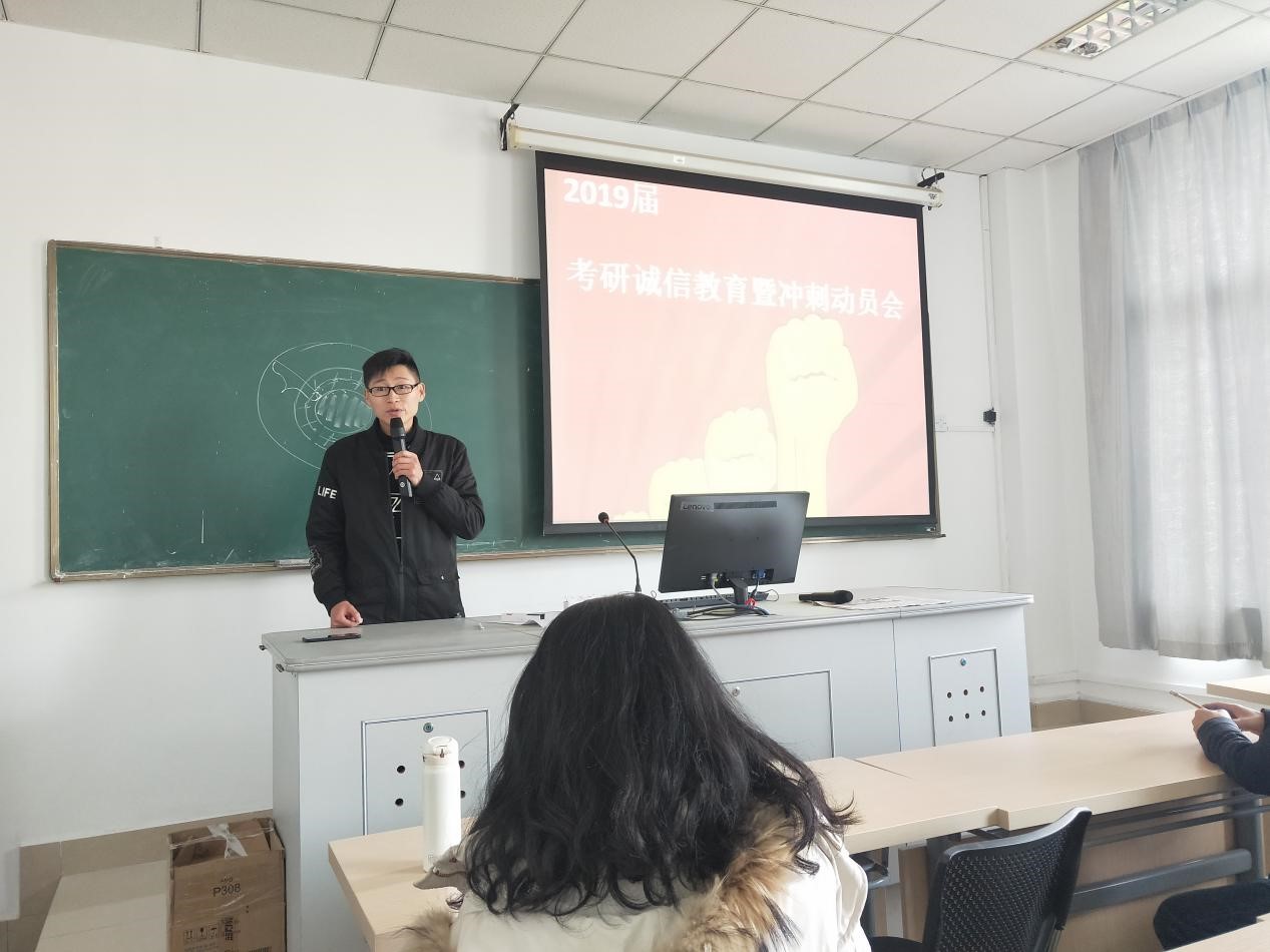 2019届考研诚信教育暨冲刺动员会在院办教学楼405室顺利展开,院党委副书记王三强、副院长钟晓文以及辅导员唐斌湖出席大会。