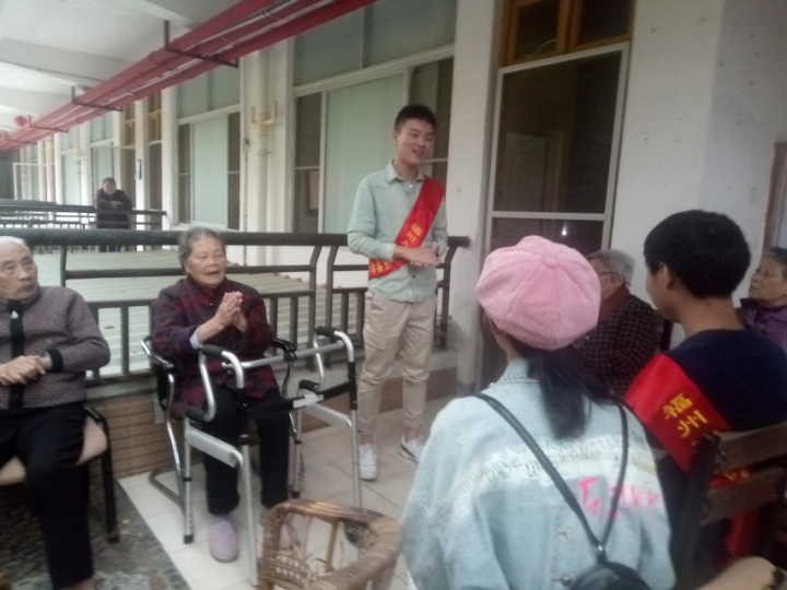 14日早7时50分,参与活动的部员准时在生活一区门口集合,领队人红十字会会长陈佳怡负责清点人数并告知注意事项,同时负责携带会旗和绶带。集体乘公交到达五福缘敬老院后,由负责人陈佳怡与敬老院相关人员对接,分发绶带,并将部员分组安排至各层。部员满怀热情,积极投入到志愿活动中。活动过程中,部员或是与老人们侃侃而谈,使原本安静凝重的气氛立马活跃起来;或是作为一名聆听者,听老人们讲述老一辈的故事;或是陪老人散步、送他们回房间,亲切的问候他们日常的生活状况;更有部员为老人们唱歌、拍照,整个敬老院充满欢声笑语。老人们对全体成员的到来表示热烈的欢迎,在离别时,也同样表达了深深的不舍与感激。