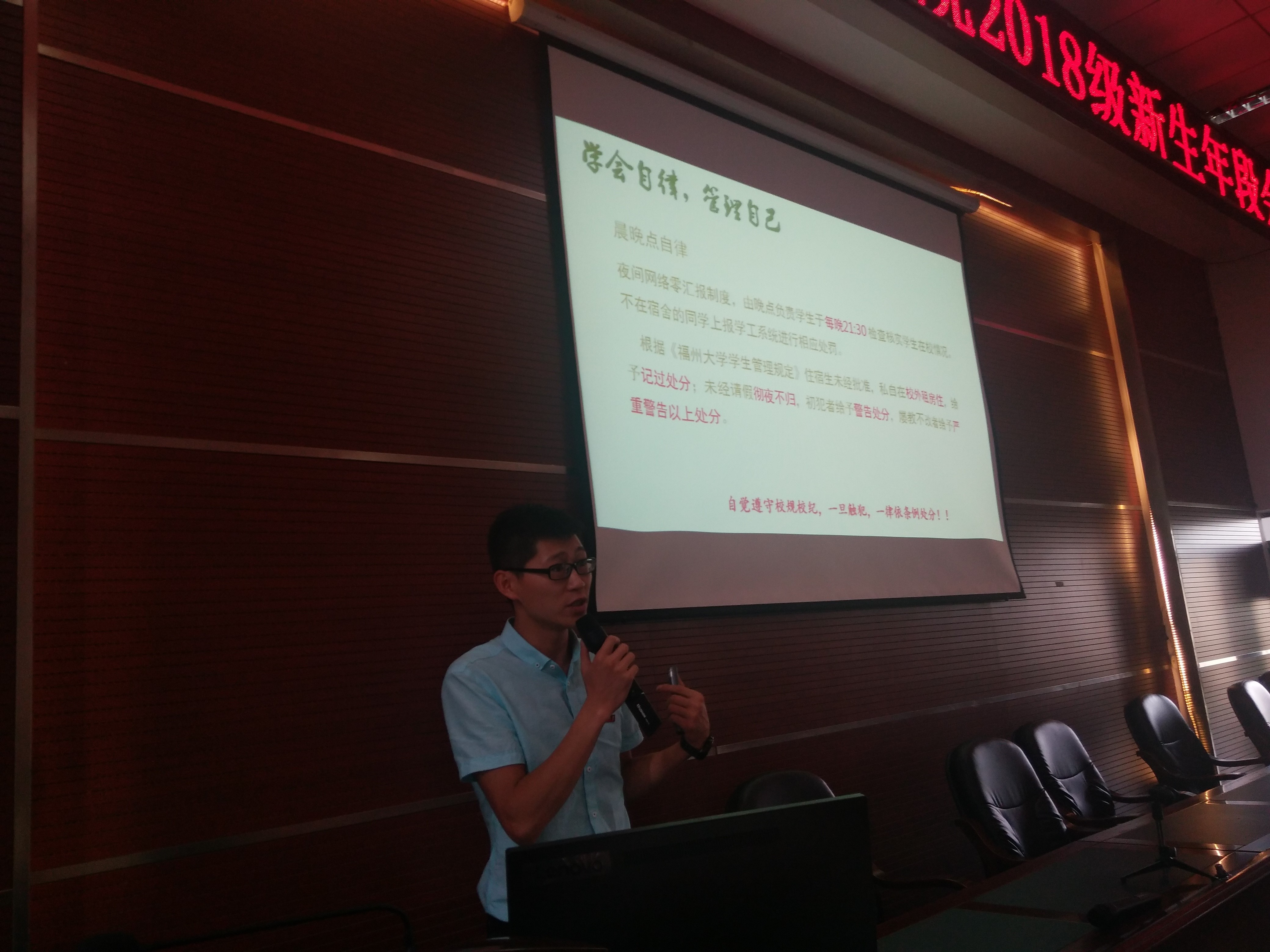 学生日常管理、宿舍管理、学风班风、安全问题、文明上网等进行了解释,并做了布置和要求;在安全问题上,强调包括宿舍用电安全以及违规电器的禁止使用,并提醒同学们注意人身、财产安全,谨防诈骗等。最后,唐斌湖老师嘱咐同学们要以学业为重,平时要加强和导师的联系,为即将开始的大学学习生活做好准备,并且思考未来的职业生涯规划。