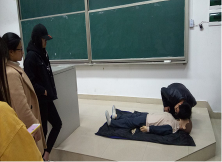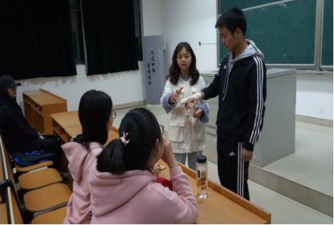该活动旨在让同学们初步掌握自救互救知识,提高自救互救技能,让急救成为我们的本能。活动的第一环节是由红会成员为大家讲解救护细节,包括评估现场环境,保己救人的原则。其中还提到了现场救护前需先说的四句话,分别是“表明身份”“请他人打急救电话”“请拿aed除颤仪”“请求协助”。紧接着红会成员在现场用假人为大家演示了急救动作后,邀请了在场观众进行现场体验,并在一旁进行指导,让同学们给假人进行心脏复苏。活动的最后进行了止血包扎练习的讲解。首先, 红会成员告诉同学们什么是创伤, 讲解了创伤常见的原因及特点。随后, 成员们就如何止血作了详细的讲解, 包括止血的方法、如何包扎、包扎过程需要注意的事项。为了使同学们更深入的了解外伤止血包扎的各项技巧, 掌握包扎的要领, 成员和同学们在教室开展了深入的互动, 对外伤止血包扎进行现场演练培训,手把手教授学生包扎的方法和注意事项。培训活动结束后,红十字会成员引导同学们有序退场,打扫活动场地并拍照留念。