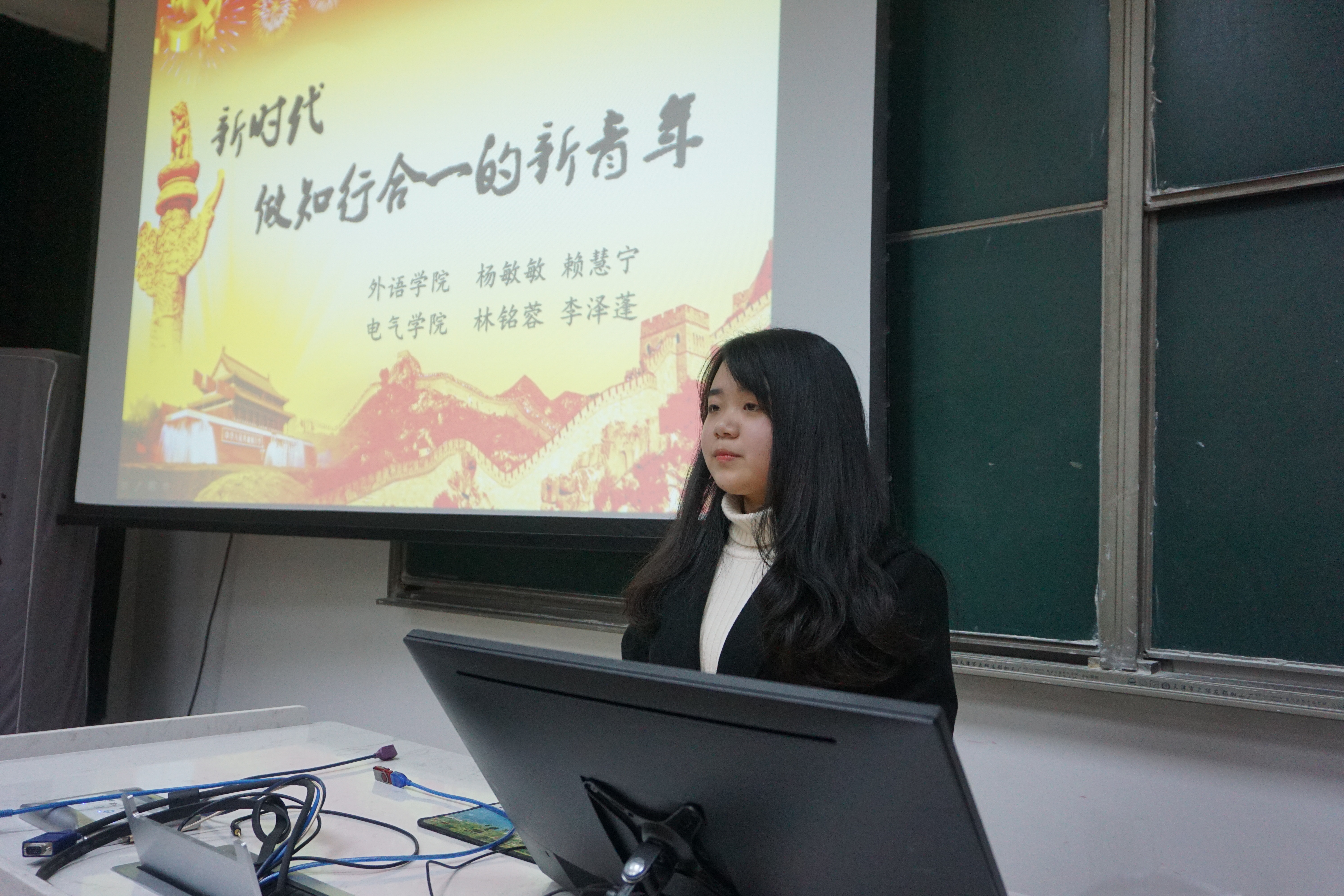 首先,杨敏敏同学为同学们播放了一段许吉如的演讲视频《国强则少年强》,并由视频引入了宣讲主题。她从新时代与新青年、“知行合一”的概念阐述、新时代对新青年的要求、当代大学生应该成为知行合一的新青年四个方面对主题进行了宣讲。随后,杨敏敏同学以习近平总书记为例,并向同学们介绍了《习近平的七年知青岁月》,告诉同学们:当代青年要以青年习近平为榜样,扣好人生的第一粒扣子,校正人生的坐标原点,志存高远、脚踏实地,学思践悟、拼搏进取,书写无愧于时代和人民的青春华章。