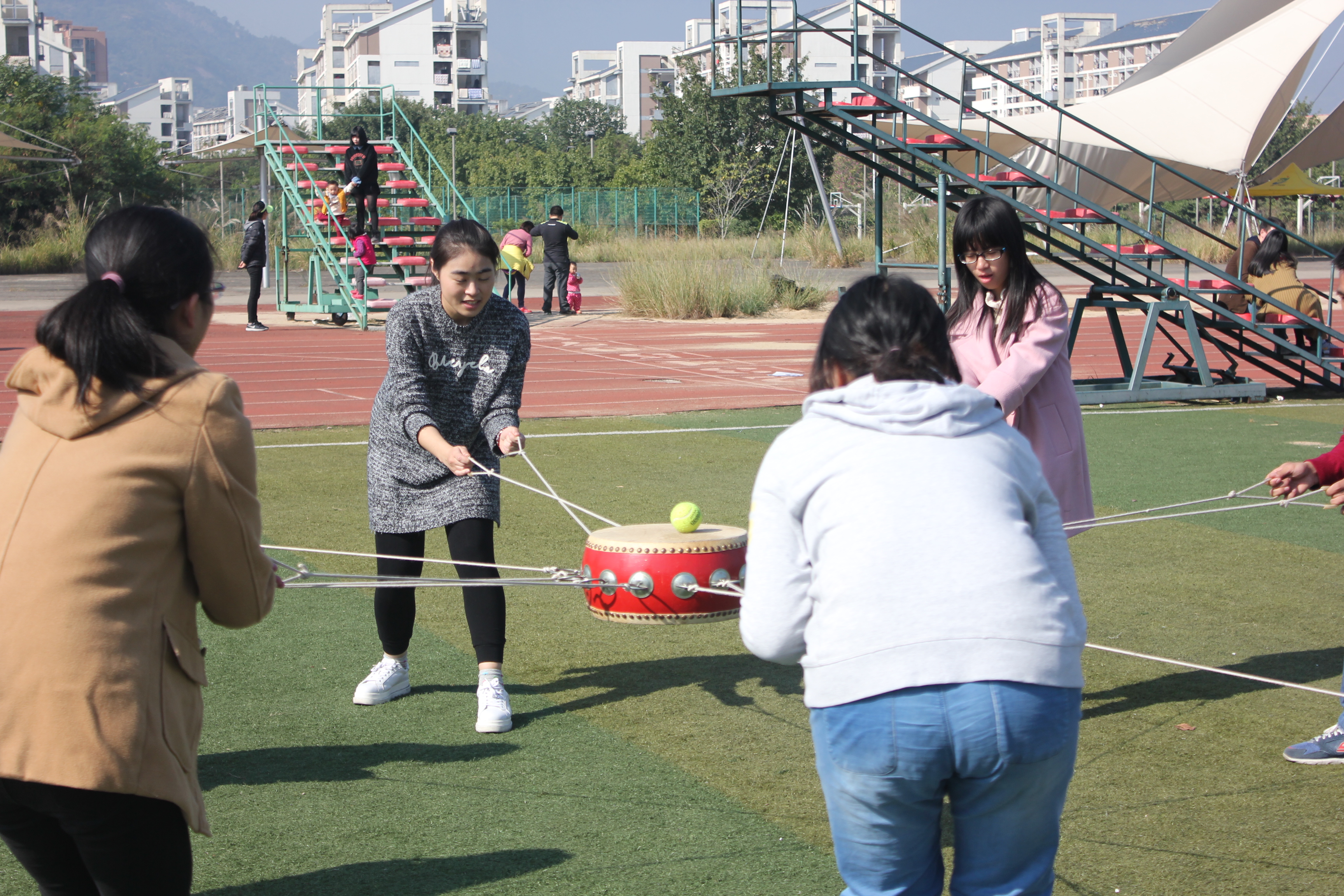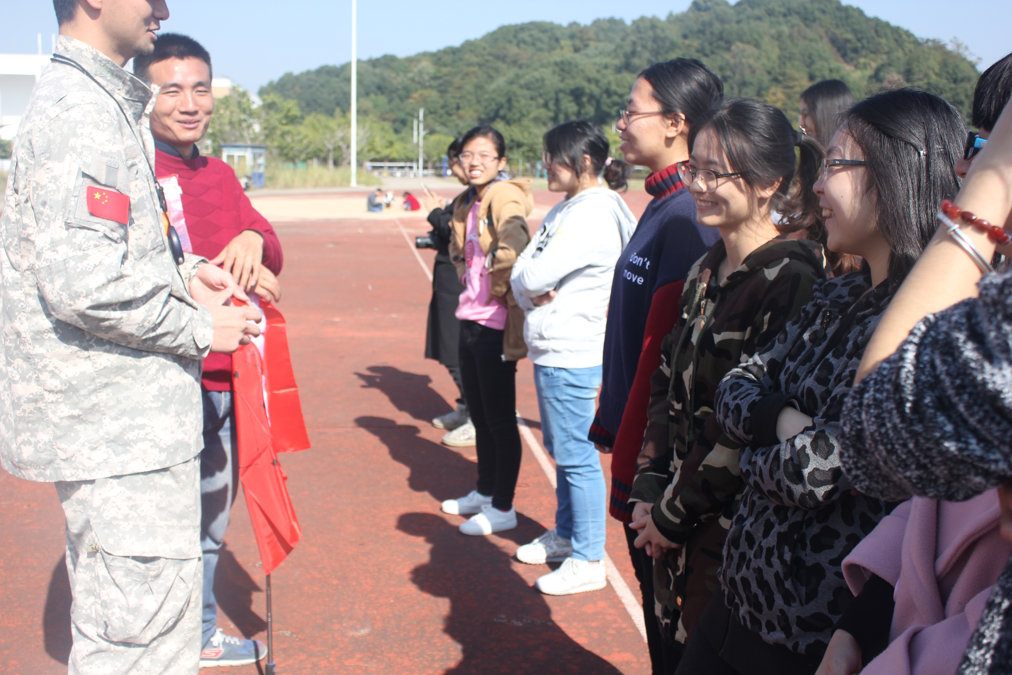 上午9点,在团委学生会的组织下,来自外院的全体学生干部齐聚操场。本次素质拓展活动首先以“桃花朵朵开”的游戏热场,并随机分成三支小队伍。三支小队伍各自想出自己队伍的名称、口号及造型,并向其它队伍进行介绍。随后,各队伍成员激情参与接下来的活动。在合作取筹码、以鼓击球等活动项目中,队员们密切配合,齐心合力。比赛过程充满欢声笑语,时时有加油声和呐喊声,处处可以感受到团队合作的力量。