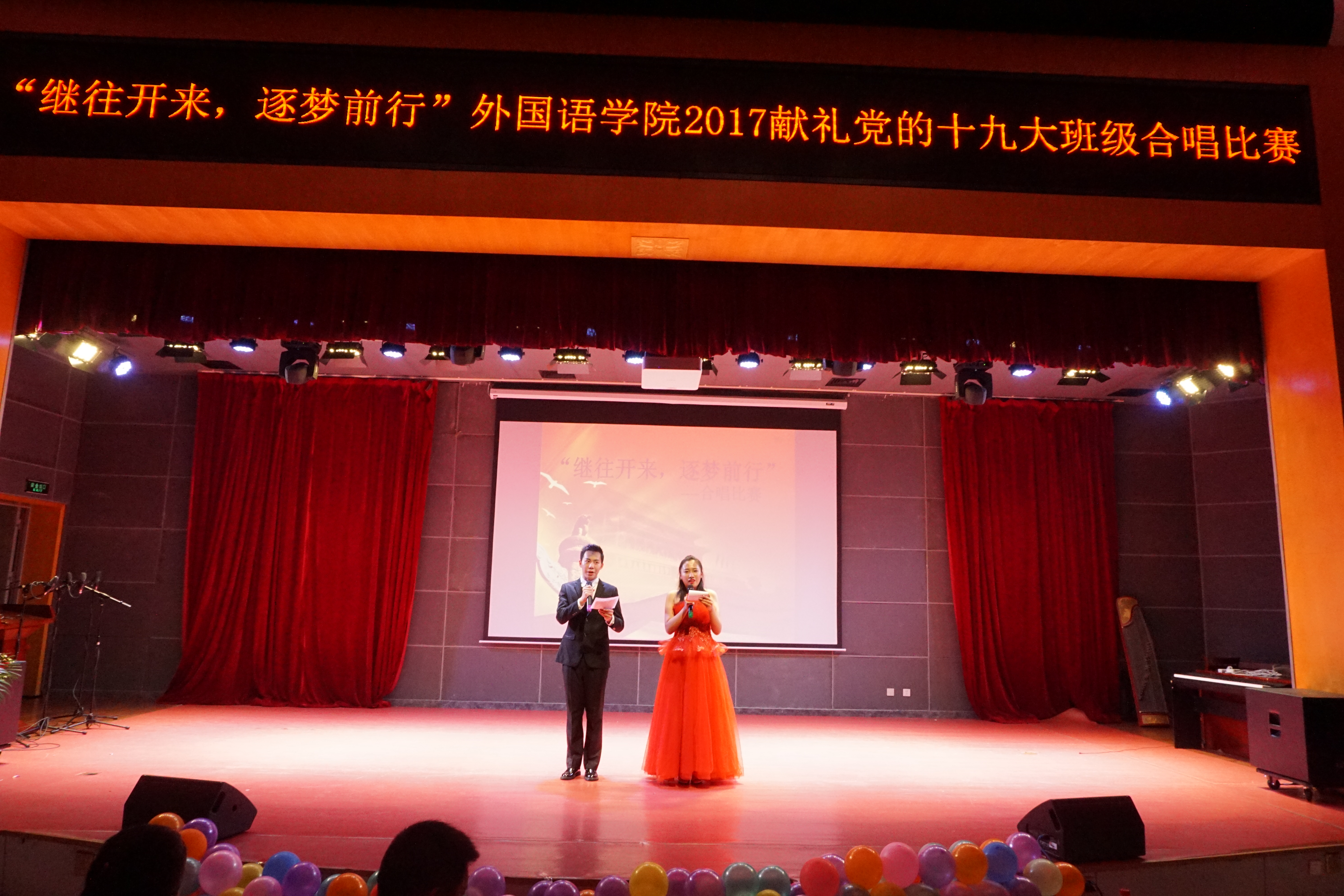 伴随着主持人娓娓道来的开场与介绍语,合唱比赛正式开始。首先上场的16级日语四班以一首自信昂扬的《我真的很不错》作为本次比赛的开场,高声呐喊着的“我真的很不错”,瞬间活跃了整场的氛围。身着朴素典雅的民国服饰,16级英语三班的学子们用歌唱与朗诵结合的方式为大家带来了两首耳熟能详的歌曲联唱《我的中国心》和《精忠报国》,热血沸腾的歌词与曲调令在场观众无不心潮澎湃。15级英语二班用一段精彩的Rap开始了他们的合唱曲目《相亲相爱》,可谓是极具创意,夺人眼球。17级英语三班充分利用自身英语专业的特点以中英联唱的形式演绎了经典曲目《友谊地久天长》,展现了了外院学子的深厚情谊。17级日语四班在流行曲目《没有什么不同》中融入了手语表演与深情独唱,以青春追梦人的形象诚意献礼党的十九大。最后出场的15级日语四班以一曲《没有共产党就没有新中国》展现了新一代青年对党和国家的自信和自豪,很好地契合了本次比赛的主题,为本次合唱比赛划下圆满的句号。