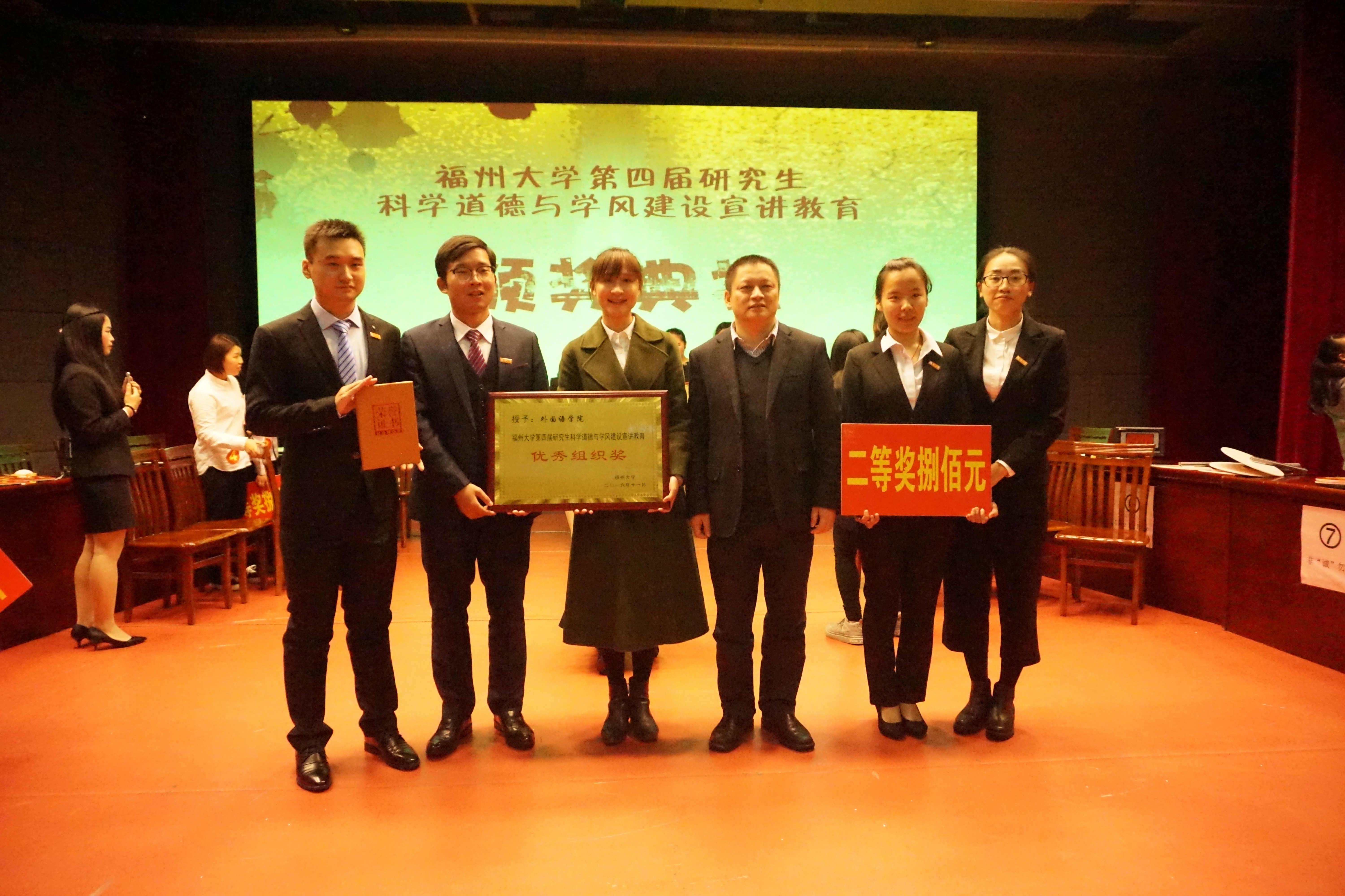 晚七时许,活动开始。在学术诚信知识竞赛部分,各学院代表队经过个人必答与团队抢答等数环节的激烈比拼,经管学院的“科信战队”凭借自身过硬的知识积累,最终逆转局势冲击桂冠。电影天堂 “非诚勿扰”战队的表现同样令人印象深刻,在数轮对决中,来自电影天堂 研究生院的孔健、杨晨芳、王晓威和王亚萍等四位同学坚持步步为营,在对手紧咬比分的时刻依旧从容不迫,最终夺得了大赛二等奖。更值得一提的是,在随后的第四届研究生科学道德与学风建设宣讲教育颁奖仪式上,电影天堂 被授予“电影天堂 第四届研究生科学道德与学风建设宣讲教育”优秀组织奖,学院长久以来在研究生科学道德与学风建设方面付出的努力获得了有力的肯定与褒奖。