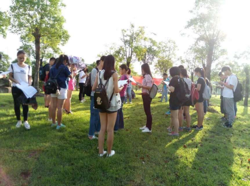 的同学带领的晨读小分队在草地上围成圈,大声诵读着晨读材料。同学们在放开声音朗读记忆的同时,也得到了英语专业同学们专业的纠音和指导,从而使自己的口语水平得到更大的提高。