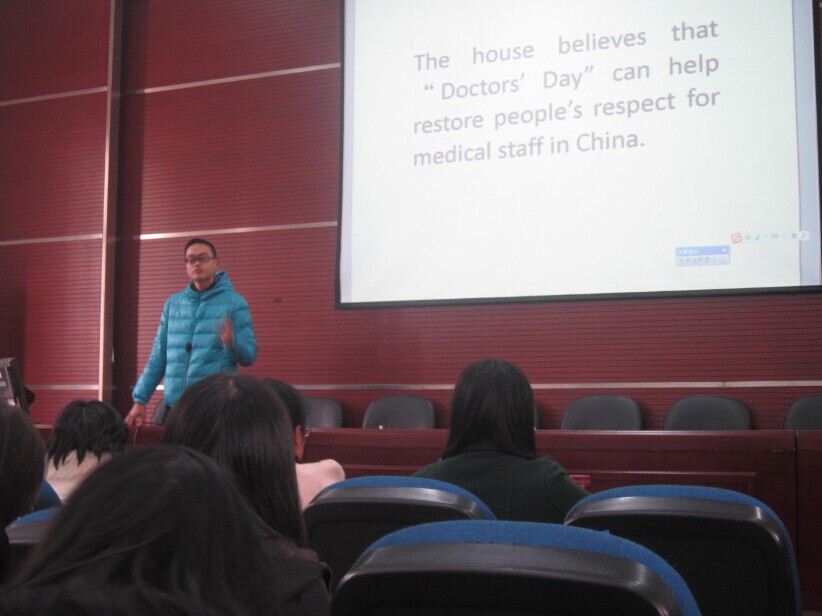 上午8时30分,第一场比赛开始。辩题与明星限薪令有关,双方成员按辩论的规则依次上台陈述观点,陈述过程中他们旁征博引,并用流利的英语进行表达,对手则在凝神倾听并不时礼貌地举手提问。第一场比赛结束后,付磊老师进行了简短的点评。第二场比赛也同样精彩绝伦,在有关设立医生日的辩题下,双方成员就本方观点从多角度进行陈述。两场比赛中,选手们风格各异,有的沉稳独到,有的热烈犀利,有的逻辑严整,有的简洁干练,高水平的英语辩论能力更是让观众叹服不已。11时许,比赛结束。本次比赛选手获奖情况如下:冠军吴雪晨、王语嫣,亚军邱哲昊、付梅珍,季军黄明、顾恺、王浩和郭靖荣。最佳辩手王语嫣,最佳语音黄智婷,最佳台风陈俊昆,最具表现力选手杨大虎。