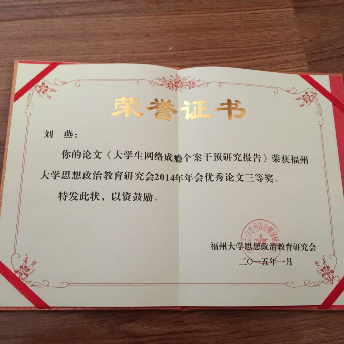 思想政治教育研究会2014年年会优秀论文三等奖。随后大会还部署了2015年大学生思想政治教育工作暨毕业生就业创业工作,召开了大学生创业工作主题报告会议等。