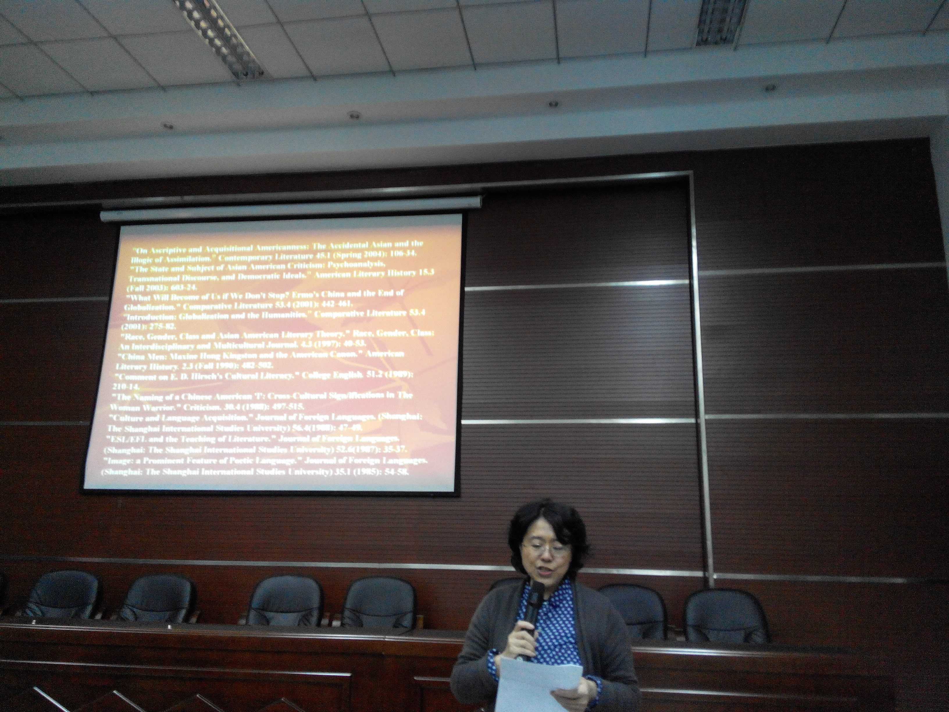 讲座首先由潘红院长为到场教师及学生们介绍李教授。据悉,David Leiwei Li (李磊伟)博士为美国俄勒冈大学英语系教授。主要研究亚裔美国文学研究、跨文化交际、电影叙事和文化等。因其学术成就,李教授应邀在德国、英国、加拿大、意大利等国大学作各类学术讲座。简单介绍过后,李教授一开讲便开门见山,直接步入今天的讲座主题——谈电影《饮食男女》。李教授从李安的“家庭”三部曲系列电影入手,很好地吸引了观众们的注意力,并从电影中的翻译以及情节为依据,步步深入、逐层分析,为观众们讲解了中美两国之间的家庭以及恋爱文化的差异。一小时后,教授的电影文化分享结束后开始了自由提问。在场的教师和学生们积极提问,李教授都不乏幽默地一一解答,赢得了在座师生的热烈掌声。最后,潘红院长为李教授颁发了受聘证书,并对李磊伟教授的到来表示诚挚的感谢和热烈的欢迎。9时许,讲座在掌声中顺利落幕。