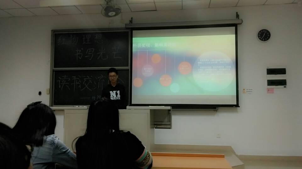 整个红书交流会包括三个环节。第一个环节是PPT展示,每班各派一个代表上台展示,选手们从容自信,深情并茂,把枯燥苍白的文字展现得绘声绘色,14级英语二班的《狼图腾》一书展示了蒙古草原上傲视群雄的狼不为人知的一面,赢得了大家的掌声。
