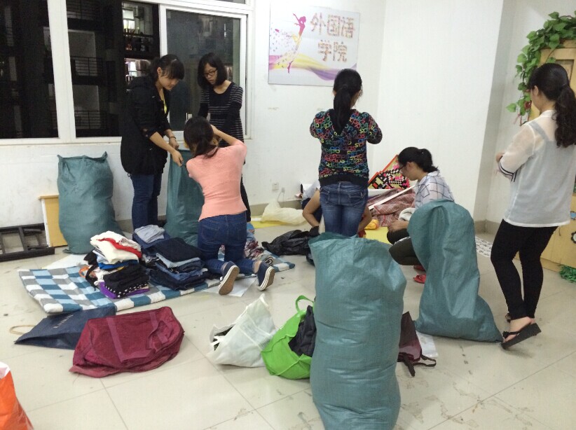 的学生们积极配合志愿者们的工作,并且捐赠了各式各样的衣物,奉献了自己的暖暖爱心。回收结束后,志愿者们满载而归,提着一袋又一袋的衣物回到了活动室。他们把回收的衣物进行分类,然后折叠好,再进行包装。