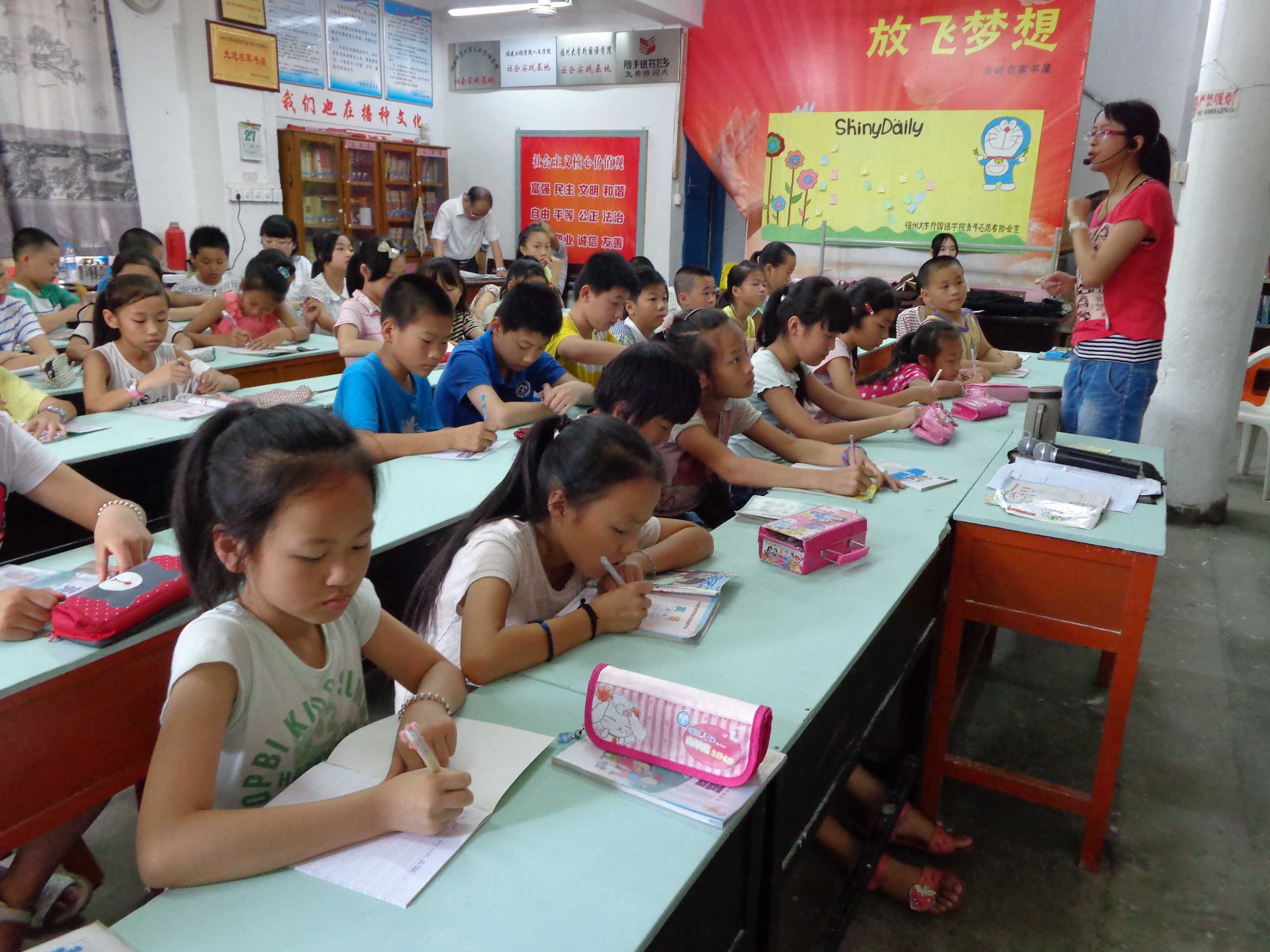今天是青年志愿者协会进行农家书屋暑期社会实践之旅的第三天。早晨8点半几位志愿者就来到了农家书屋准备开始上午的英语辅导。9点整,授课正式开始,课程仍旧是由两位志愿者依次上台教授一个小时,首先志愿者老师详细地给小朋友们讲解他们前天作业中出现的一些错误并对知识点做稍微的复习,之后进入今天的新内容。今天的两位志愿者老师都是来自大一,虽然之前并没有参加此类活动的经验,然而她们的授课却十分精彩。“小老师”陈书英气场十足,上课节奏紧凑讲究效率,也很善于利用一些小游戏来激发小朋友们学英语的兴趣和热情。陈诗雨“小老师”温和而不失气势,循循善诱,注重细节,亦深受小朋友的喜爱。书屋的负责人陈爷爷对这两位志愿者老师也很赞赏,评价她们两位是不同风格,各有千秋。