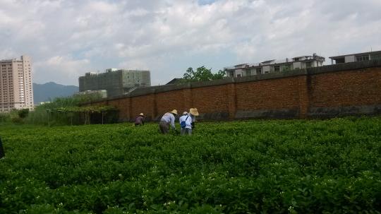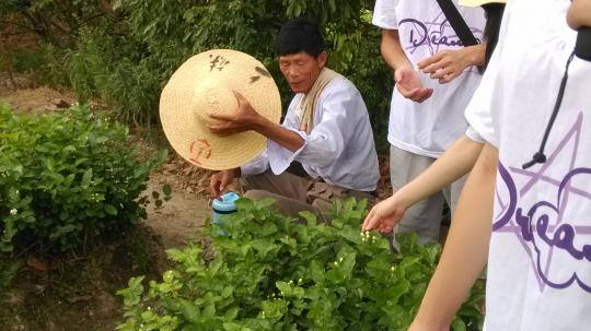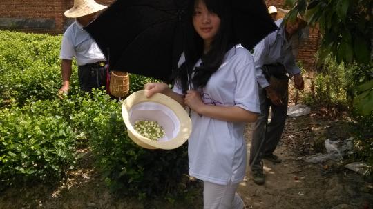 下午两点左右,同学们到达所属岐安村的一块农田。首先,映入同学们眼帘的便是一大片绿油油的茶园,瞬间被这纯粹而美丽的自然美景所震撼。这样生动的绿意也让汗流浃背的同学们暂时忘却了炎热。接着,同学们找到负责该茶园的农民伯伯,向他咨询了一些有关茉莉花种植的知识,了解到我们喝的茉莉花茶原来是经过诸多繁琐复杂的程序加工形成的。这让大家更加想投身到采摘茉莉花的工作中去。经过农民伯伯的示范以后,同学们个个饶有兴致,跃跃欲试,想要当回采茶男女。梅珍同学还将采摘的花放进她的遮阳帽里作为成果展示。大家纷纷表示,能够通过自身努力而帮助农民伯伯减轻烈日下的工作负担,感到十分充实。