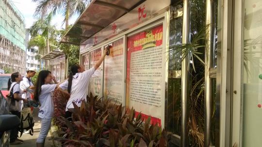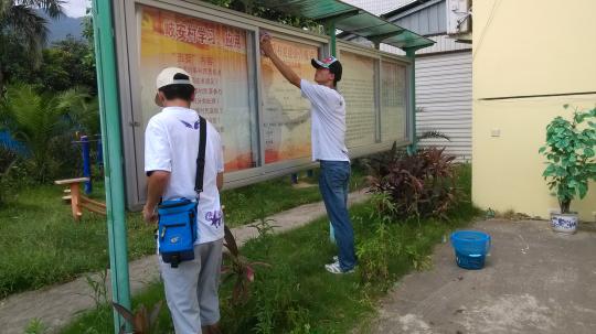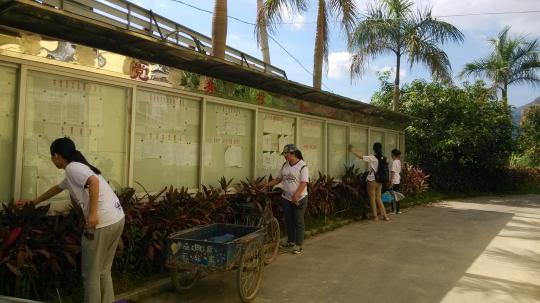 12级英二绿团的12个队员们到达歧安村,开始了第三天的暑期实践活动。他们此行的目的是清洗歧安村的宣传栏,让党的精神和农村精神更加鲜明。与村长沟通好后,在村长的带领下,来到了宣传栏前。虽然烈日炎炎,但是丝毫不减队员们的热情。在大家的合力努力下,经过一个多小时的清扫,宣传栏焕然一新。清洗完成后,队员们还兴致勃勃地向村民们介绍了宣传栏里面的相关知识,进一步促进了村民们对党和国家有关政策的认识。