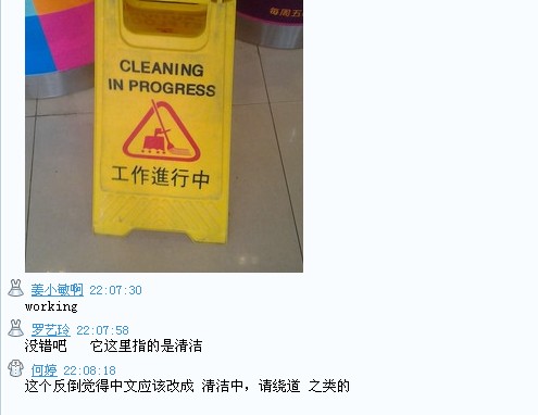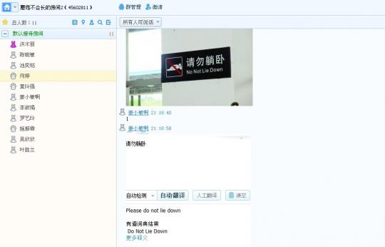 随着福州经济不断发展,对外交流越来越密切,英语在生活中地位也越来越突出。福州在很多公共场所都采用了双语标识,但这些公共场所的英文标识却存在很多错误。在 21 日上午的公共英文标识寻错活动结束后, 21 日晚 9 点, 12 级英语3班的暑期实践小组的 同学们 利用网络 QT 语音,针对上午寻找到的英语标识翻译错误展开线上讨论。 本次活动共有13人参与,历时一个半小时。