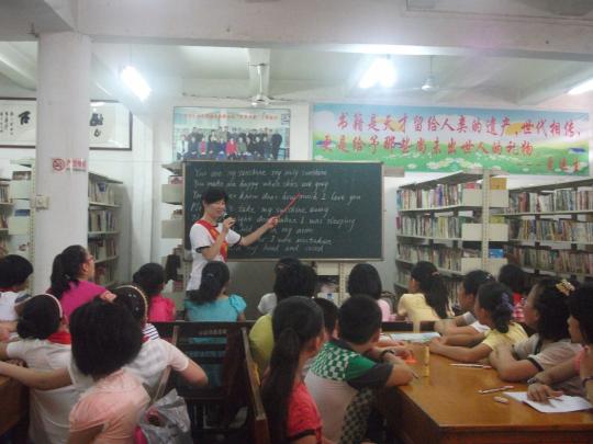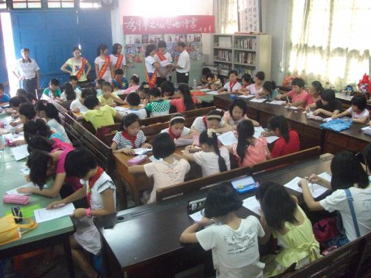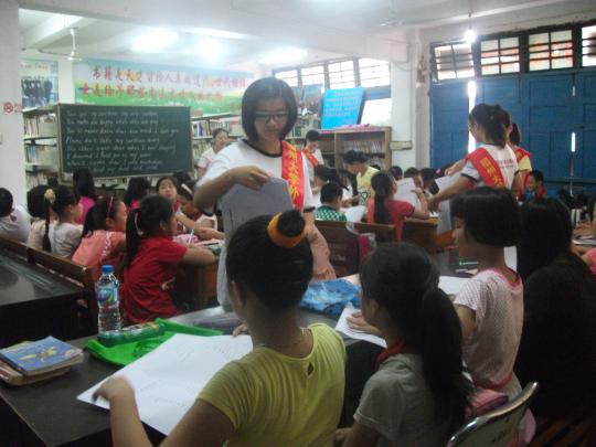 天气虽然炎热,但志愿者们仍早早赶到书屋,美好的早晨便在温馨的《You Are My Sunshine》合唱中开始。接着是紧张的阶段性考试,孩子们仔细作答,志愿者们孜孜不倦地批改,及时地将成绩反馈给孩子们并认真讲评了试卷;随后,暑期社会实践队的负责部门青年志愿者协会部员们分发“关爱身边,你我同行”问卷调查给孩子们填写,了解孩子们对此次支教活动的评价、收集意见和建议以及了解他们的英语学习现状,以便今后进一步提高教学的质量和效率。