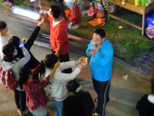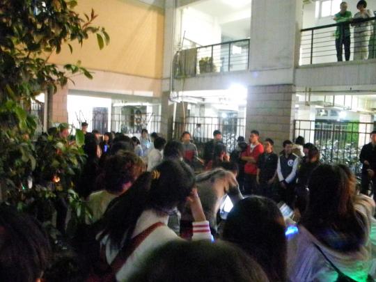早在晚会之前,两委办的同学们就策划组织了各种各样的惊喜来表达对男生们的心意。在男生们晨点时送上寿司,用气球和纸飞机精心装饰宿舍楼,为男生们拍摄祝福视频等等。一个个惊喜成功地营造了节日的气氛。晚上九时许,节目尚未开始,4号楼楼下就聚集了一批手持荧光棒前来祝贺的女生们, 9时30分,晚会在女生们《对你有感觉》的深情献唱中开始。两委办的同学们特地借来了闪光灯,为这个夜晚带来了五光十色的梦幻色彩。除此之外,女生们也在这次晚会中的游戏环节准备了精美的礼品。节目进行到高潮,现场气氛极其热烈。游戏环节中,女生们蒙着眼喂食男生们小面包,现场气氛十分温馨。12级日语2班的女生们亲自来到男生宿舍为班上男生送上温馨的礼物。热情的表演引得男生们纷纷走出宿舍到走廊上观看,并且时不时发出阵阵喝彩,上错花轿、经典桥段接龙、叠报纸等游戏互动环节更是将晚会引向高潮。10时30分,晚会下外院男女生们的温馨合唱中落下帷幕。