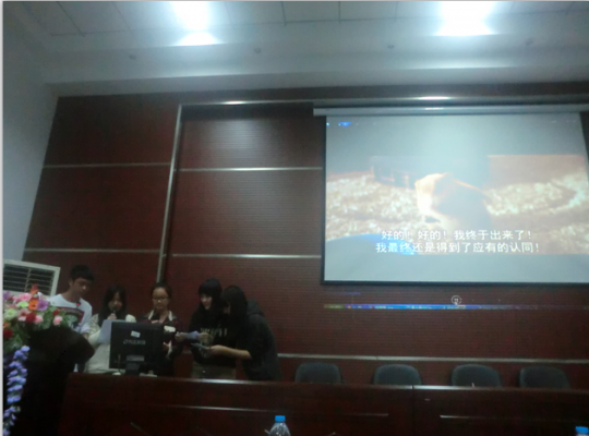 首先由主持人介绍来宾并宣布此次比赛的规则、要求和评分标准后,然后配音大赛正式开始。选手们并没有因为上台而紧张,反而充分发挥了自己的才艺特长,全身心投入到角色当中,将角色声音的特点展现得淋漓尽致。随着片段的节奏,他们的语调或高亢洪亮,或幽默滑稽;他们的情绪或慷概激昂,或开怀大笑。选手们的真情演绎使得台下的观众身临其境,意犹未尽,自发为其鼓掌喝彩。值得一提的是,一些小组选择了相同的配音片段,这不仅让两组之间的比赛更为激烈,也使得比较更为直接,但是,每个小组都表现不俗,展现出属于自己的特点。