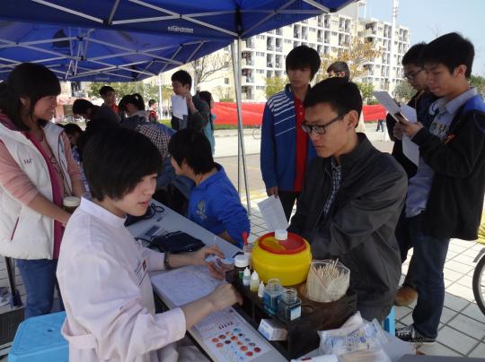 上午9时,献血现场一切已布置就绪。此时明媚的阳光正如同学们的善心一样,正温暖照射着。在此等候献血的同学纷纷开始向在场的工作人员询问献血的有关事项,比如自己的身体状况是否允许献血等等。询问完毕的同学们纷纷开始登记个人信息、填写体检表、进行体检、验血等。验血完毕的同学便进入采血车进行采血。献血过后,现场的工作人员们也都给予了献血志愿者们良好的照顾,并提供葡萄糖水,以帮助志愿者们快速恢复体力。待到志愿者们休息充足后便可以领取献血证和献血纪念品。虽然献血现场人来来往往,但整场献血进行得有条不紊。最终,活动在下午5时顺利结束。