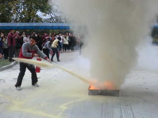 为保证此次消防演习安全进行,学院做了充分的前期准备工作,不仅安排了各楼梯口的疏散人员,还通知辅导员在年段会上讲解消防演习的注意事项,除此之外,各班班委也积极动员本班同学进行演习准备。下午2时,指导老师在5楼放出烟雾,并吹响演习哨声,同学们用湿毛巾捂住口鼻有序地撤离了宿舍楼。到达集合场地之后,由各班班长清点人数,确保各班同学都安全到场。随后,老师们对本次消防演习的具体细节进行了点评,并对火灾发生的原因和灭火理论进行了介绍。接着老师开始为同学们讲解灭火器的使用方法和注意事项,通过讲解,同学们对于火灾的处理有了一个更深层次的认识。之后同学们在老师的指导下,通过实际操作掌握了灭火器的使用方法。最后在老师的演习总结后,本次消防演习圆满结束。