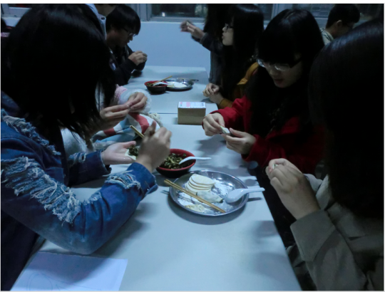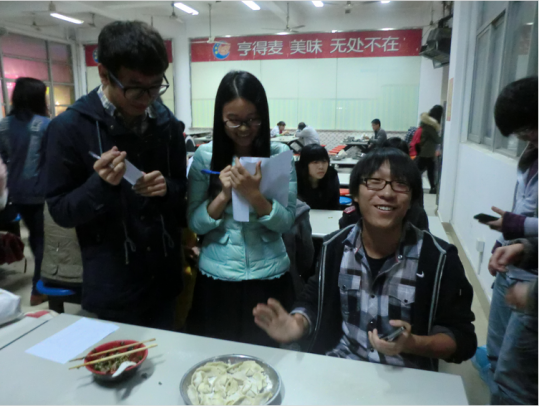 比赛时间未到,到场的参赛人员们已经跃跃欲试,讨论着将以什么样的创意出奇制胜。主持人介绍完比赛规则后,各队纷纷开始动手。每个人都在努力地包出团队的创意,在过程中探索饺子的美观性等,最终各队的成果也都独具风格。待到评委们打分完毕后,众人的饺子下了锅。饺子起锅后,食物的香味与欢声笑语洋溢在食堂中,现场成了欢乐的海洋。最终,11级德语班的“天之骄子”队获得了本次比赛一等奖。