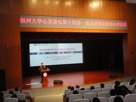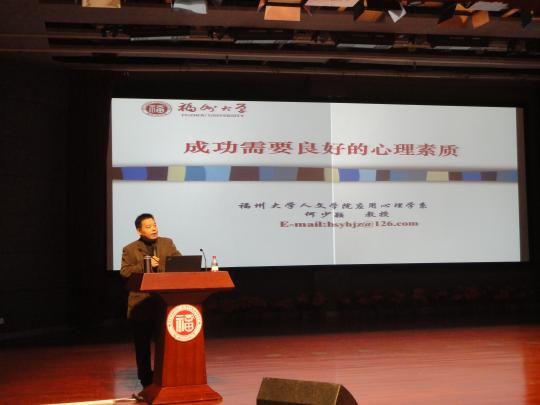 晚上七时,讲座在何少颖教授富有亲和力的发言中展开,首先,何少颖教授对心灵讲坛活动给予了充分肯定。演讲伊始,何少颖教授通过举例子的方式,和同学们共同分享了经历失败的名人故事,通过刘翔、李宗伟、埃蒙斯等运动名将的奥运会经历向同学们分析了失败的原因,他指出成功与否并不只是局限于比赛的输赢,精彩的讲解使同学们对于成功的定义有了更深的了解。接着,何少颖教授通过展示富有视觉欣赏价值的图片和在场观众进行了互动,通过轻松愉快的方式让同学们对心理学的概念、研究对象和心理现象有了初步的了解。随后,何少颖教授指出,在“高科技、高生产力、高危机、高病态”的社会背景下,人们存在着各种各样的心理问题,他通过举出名人事迹和发生在我们身边的事例,包括:中青年人才“过劳死”现象、各类自杀事件等,为同学们分析了当代社会存在的情绪负重、心理健康缺陷的心理问题,同学们切身体会到了心理健康的重要性。紧接之后,何少颖教授分析了中国当代成功者的九大因素,涉及到个性、承受力、信念等各个方面,其中心理素质占了这些因素的大部分。