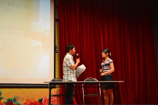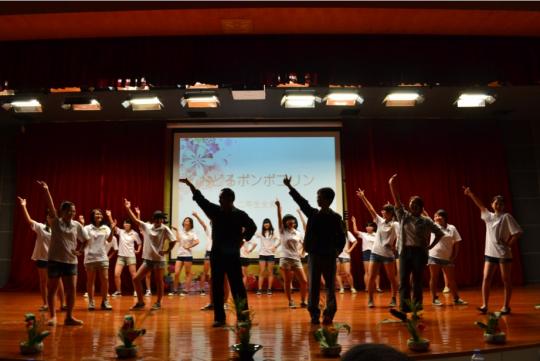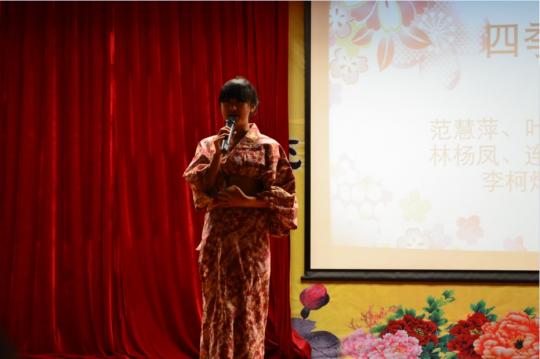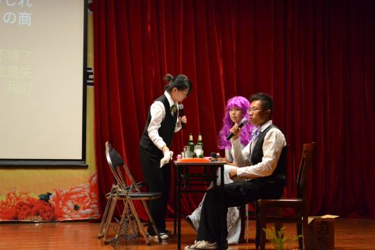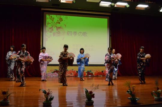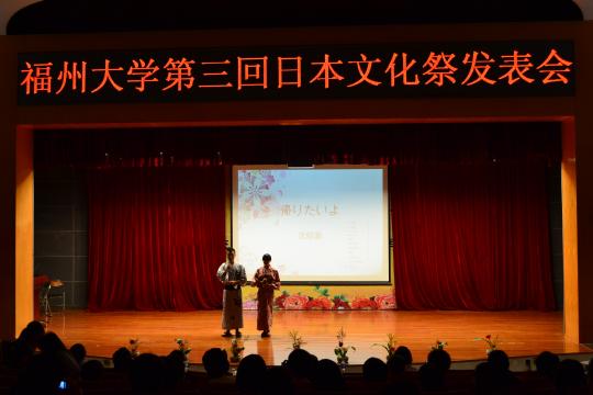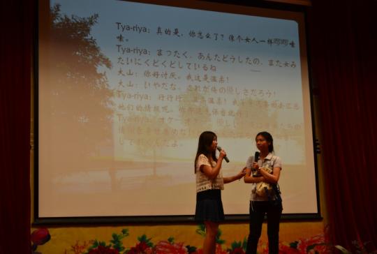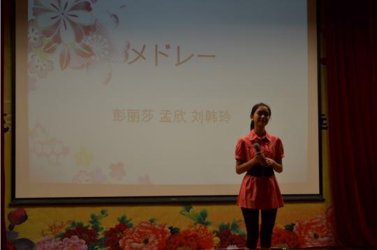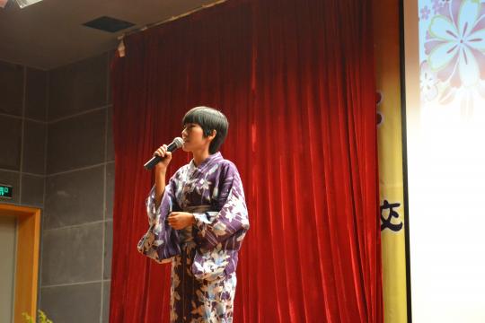 活动一开始,酷玩协会就以眩目的舞姿迅速点燃现场观众的热情。随后,气势如虹的剑道表演、深情款款的歌曲演唱、绘声绘色的鬼故事朗诵以及生动传神的话剧表演为现场观众打造了一场丰富的视觉和听觉盛宴,让观众们大饱眼福,现场掌声接连不断。在《四季歌》悠扬的旋律声中,八位身着和服、笑靥如花的女子款款走来,优雅的舞姿带观众们领略了一番独特的东瀛风情。接下来的活动更是精彩纷呈:惟妙惟肖的动漫配音,引发在场观众的阵阵欢笑声,诙谐幽默的校园话剧,大三学生们经常演绎了大学生活的美好点滴,表演引起了现场观众的一致共鸣,把晚会推向高潮,最后,日语系大二学生们与外教一同登台演出,简单可爱的舞蹈动作将轻松愉快的氛围传染给每一位观众。在观众们的掌声和欢呼声中,活动圆满落下了帷幕。