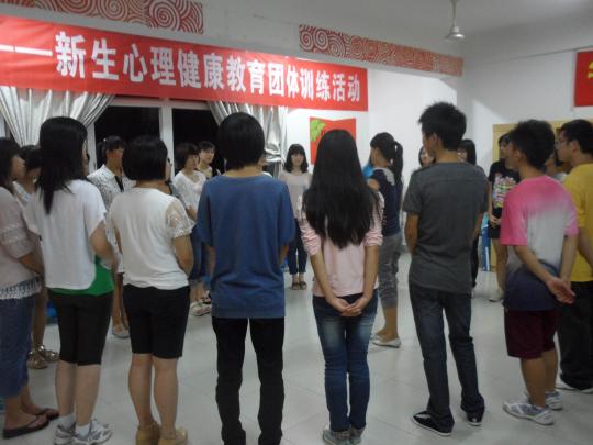 心理健康部主办,活动邀请到了辅导员黄柑莲老师和校心理健康中心的老师黄瑞枫。团训开始,所有参加团训的新生围成一个圈,在黄瑞枫老师的指导下开始心理小游戏。通过小游戏原本不熟悉的同学们慢慢认识对方,游戏过程中充满欢声笑语,气氛高涨。
