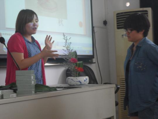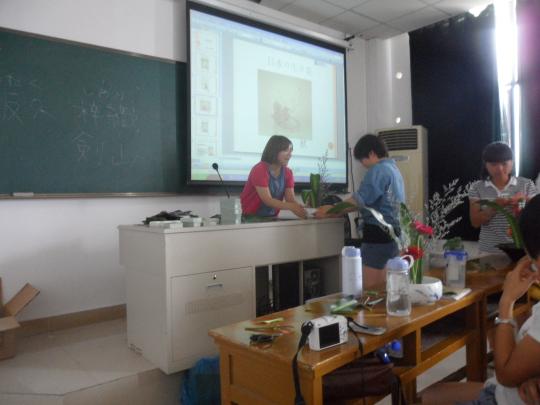 接着,板久梓織老师为大家示范正确的插花艺术流程,带领同学走进花道文化的世界。其精彩的讲解和精湛的插花手艺赢得了同学阵阵赞叹之声。紧接着,同学们在板久梓織老师的指导下分为若干小组进行现学现插,更进一步了解、体会日本花道艺术的精髓。活动最后,同学们一一展示自己的作品,老师也对所有的作品逐个进行点评,为同学指出存在的问题。虽然活动时间有限,但在习得插花艺术基本技能后,有兴趣的同学今后仍可继续钻研,或向老师请教。