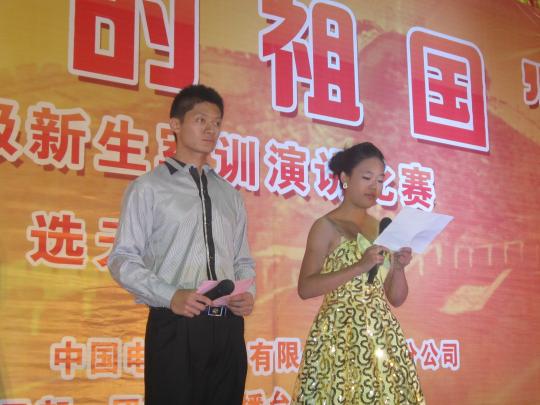 的王路平同学,以稳健的台风,铿锵有力的声音,将自己的爱国情怀表达得淋漓尽致,一次次赢得观众的喝彩。她让所有的福大学子感受到电影天堂