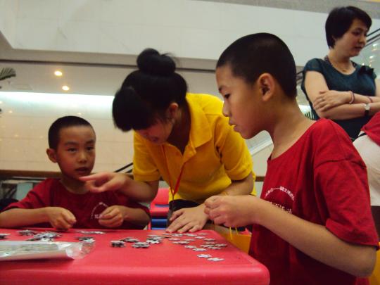 接下来,是孩子们最期待的社教活动:“感受历史,快乐拼图”。小学员们每两人为一组,共同完成图案为博物院文物的拼图。我们的七位志愿者分别分配到蓝莓队、苹果队、芒果队中,指导孩子们完成拼图。在活动过程中,孩子们兴致很高,全身心投入到拼图中,分工合作,完成自己的拼图之后协助其他队友一起需找图案,表现出团队凝聚力。志愿者们也和孩子们一起拼图,虽然拼图不是简单的工作,需要耐心和观察力,分析力,但是在拼图过程中志愿者和孩子们都享受了团队合作的快乐。而本次拼图比赛最终蓝莓队获得冠军。无论是否获得冠军,喜悦依旧溢满每个人的脸庞。