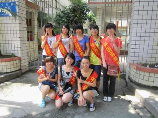 暑期社会实践活动之关爱空巢老人实践小分队在校门口集合,一同搭车前往夕阳红公寓,开始走进空巢老人之旅。