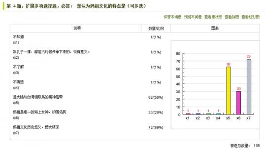 调查问卷的数据显示,近九成的受调查学生没有去过湄洲58%的学生认为妈祖文化与自己的生活基本没有相关性;57%的学生对妈祖及其他民俗文化不甚了解等。以上说明,