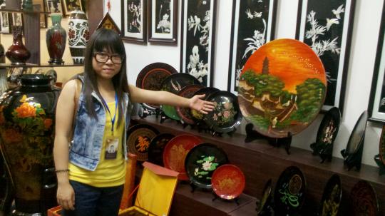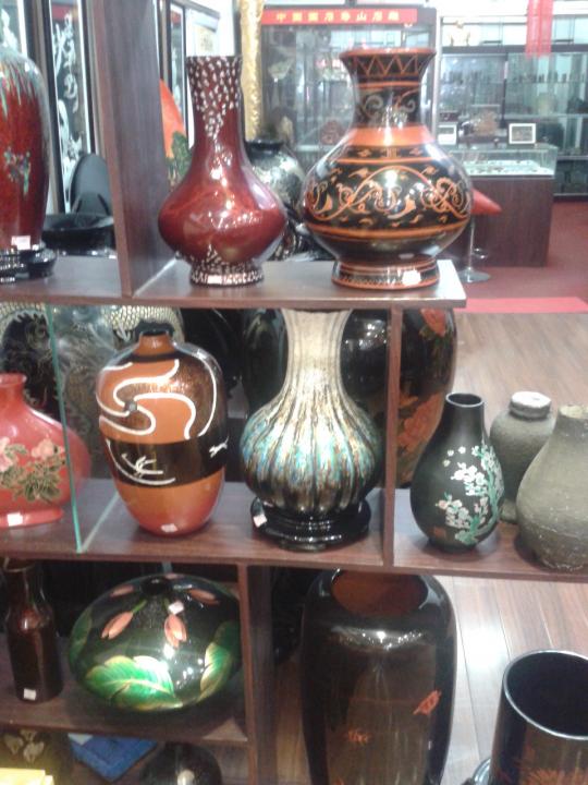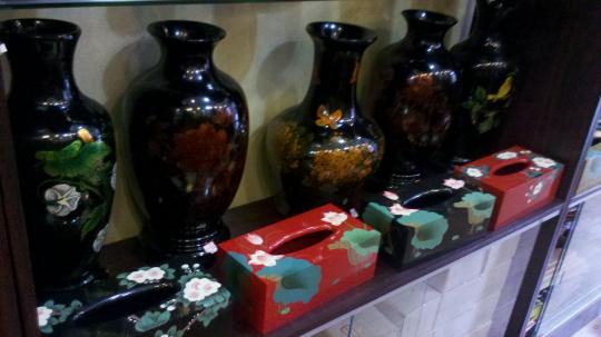 ,享誉国内外。一进入临街的商铺中,映入眼帘的是造型各异的脱胎漆器,有画着不同主题的漆盘,有形状不一的漆瓶,还有精美实用的纸巾漆盒等等,可谓将工艺性与实用性完美融合,令小分队成员们看的目不暇接,不断赞叹。在与商铺老板的交谈中小分队成员们了解到,福州脱胎漆器最大优点是:光亮美观、不怕水浸、不变形、不褪色、坚固、耐温、耐酸碱腐蚀,其最大特点是:轻。福州脱胎漆器所具有的这些优点、特点,是由其特殊的制作工艺、高超的髹漆技艺所决定的。每件成品都要经过几十道、甚至上百道工序。工艺非常复杂,因此才得以有此优特点。