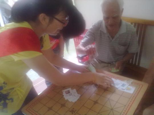 在那里,有的志愿者手把手地教他们玩简单的纸牌游戏,有的和老爷爷在棋盘上斗智斗勇,有的和老人家手拉着手亲切地聊天。刚开始,老人们显得有些生疏。通过志愿者们耐心的说明与悉心的教导之后,老人们很快和志愿者们打成一片,老老少少的脸上都露出开心满足的笑容。
