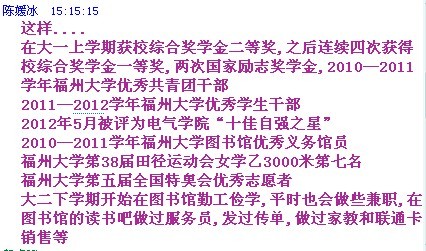 图书馆“优秀义务馆员”。不仅如此,她还积极寻找社会兼职的机会,当过家教,做过发单员,任过联通卡销售员等,在工作中踏实努力,自力更生。在今年