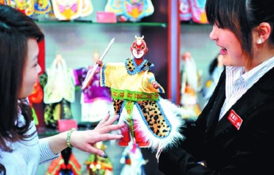 工作人员(右)在向实践队队员演示如何操纵布袋木偶进行表演
