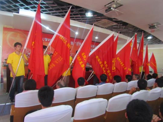 重点队“农家书屋-支教之行”在第三组上台接旗和接牌。实践队全体队员以及前来参加的队员们着装整齐划一,怀着强烈的责任感接受了旗帜和牌匾。