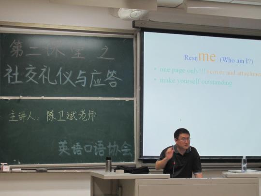 本次演讲的内容主要是关于在面试中的社交礼仪。一开场,主讲人陈卫斌老师以流利的英文提到今天是农历的立夏,并和同学们分享了他对这个节气的感受,大大活跃了现场的氛围。紧接着,陈卫斌老师发表了他对处于不同时间阶段大学生的独到看法和见解。老师的精彩演讲内容贴近同学们的日常生活,进一步引起了现场同学的兴趣。演讲在轻松愉快的氛围中正式进入正题,陈卫斌老师主要将演讲内容重点放在英文简历和面试这两个方面,以流利的语言娓娓道来,依次为同学们讲解了英文简历中应该注意的问题和面试者常被问到的问题。老师结合自己的个人经历,演讲细致入微,以真实可感的实例和朴实亲切的话语,为在场的同学上了一节深刻的课。在场的同学受益匪浅,现场气氛活跃,老师的精彩演讲博得了同学们的阵阵掌声。