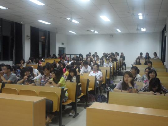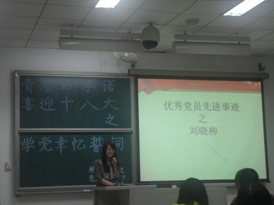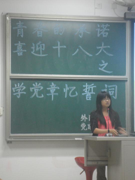 党建部举办的“青春的承诺 喜迎十八大”之“学党章 忆誓言”理论学习活动于文1-404顺利进行。各年级党员、入党积极分子、班委等参与本次大会,同时,大会还邀请了09级新进党员卢丛珊、郑伟艳、刘晓柳上台演讲。