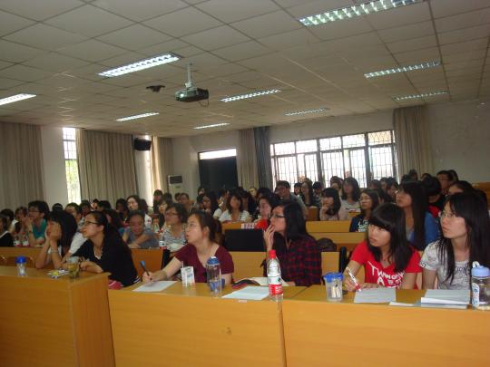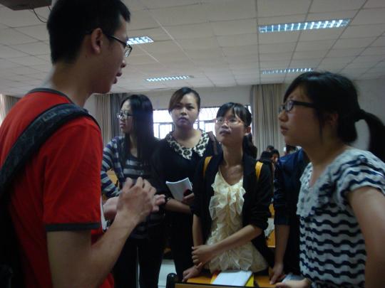 这三位同学分别是已经被录取为研究生的陆神容,詹锦艳,王鹏。他们有条不紊,针对初试和复试进行较为详细的讲解,并交代了考研过程注意事项。在介绍过程中,他们用自身的例子,幽默轻松的口吻,吸引了台下所有人的注意力,场上不时的发出掌声。最后他们还鼓励大家,尽管考研的日子是艰辛的,但是只要肯付出就会有收获。