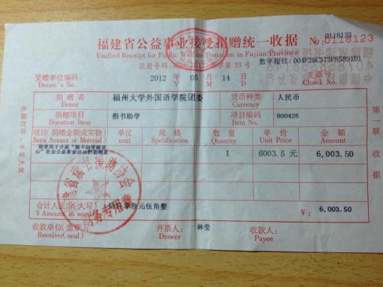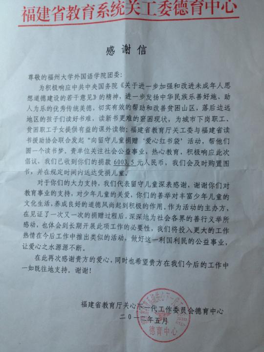 5月12日,由福建省教育厅关工委德育中心、福建省读书援助协会主办,电影天堂 青年志愿者协会、红十字会承办的“爱心红书袋”募捐活动在西湖公园和东街口进行。此次活动受到福建省教育厅关工委德育中心的高度赞赏,为此,他们特地发来感谢信,表示已经收到电影天堂 团委的捐款,并及时购置图书送达受捐儿童。同时,关工委德育中心对此次活动的重大意义给予高度肯定,并对我们今后的志愿服务活动寄予了高度期望。
