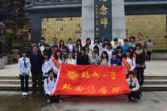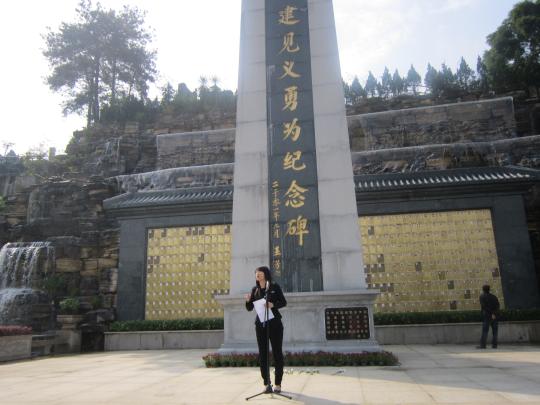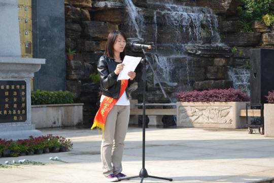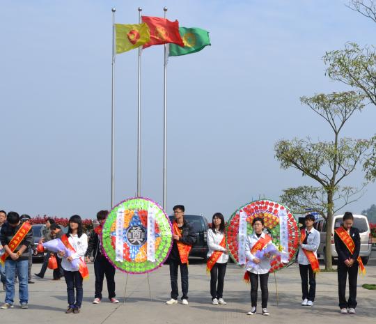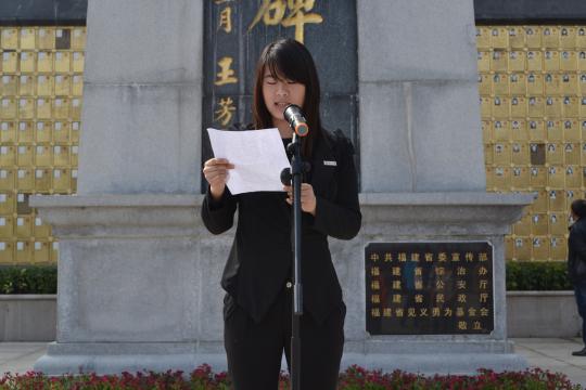 上午9点各班党积已经到达陵园的见义勇为广场,等待活动的开始。在与烈士陵园集团总经理林总商议好整个活动的流程后,祭扫活动正式开始。首先,学生代表黄玉洁致开幕辞,向大家说明此次活动的意义,其次是学生代表张胜美致辞,代表广大学生表达对烈士们的哀思和崇敬。接着,林总与学生代表一起进献花圈,而党积们也是手执鲜花向烈士照片墙献花。伴着广场上奏起的哀乐,大家沉重地低头默哀3分钟以表示对亡魂的悼念。深深的哀思过后,黄玉洁带大家向烈士们庄严宣誓,铿锵有力的宣誓声飘荡在广场上方,党积们谨记要成为继往开来的新一代,并为之努力。宣誓过后,大家怀着崇高的敬意参观烈士陵园。